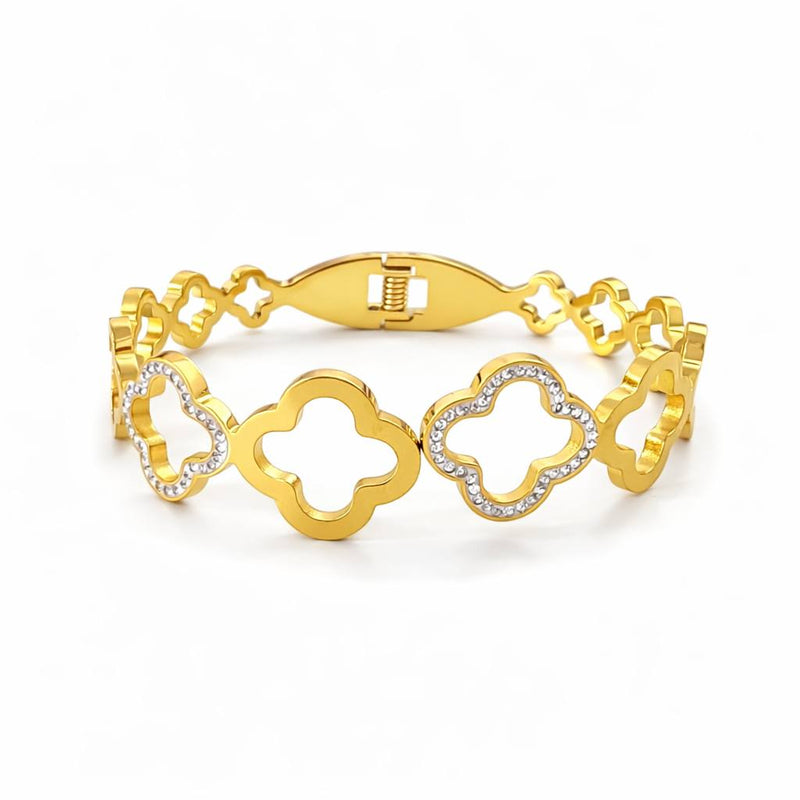 Bracelete - Trevos Grandes Cravejados - Joia em Aço Banhada a Ouro 18k