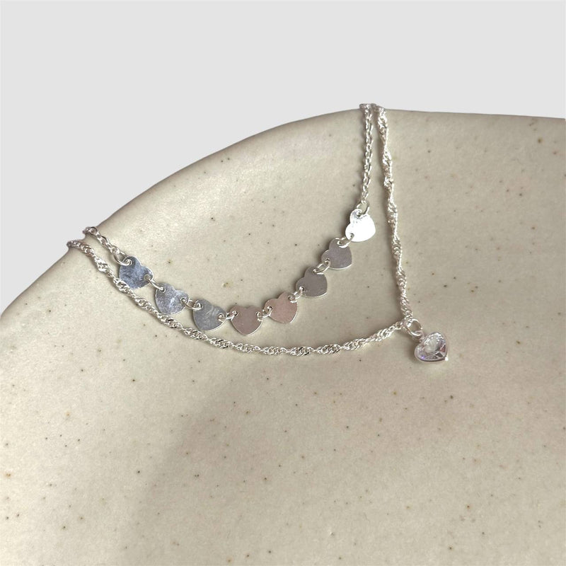 Pulseira Dupla - Corações em Medalhas e Zircônia - Joia Banhada a Prata