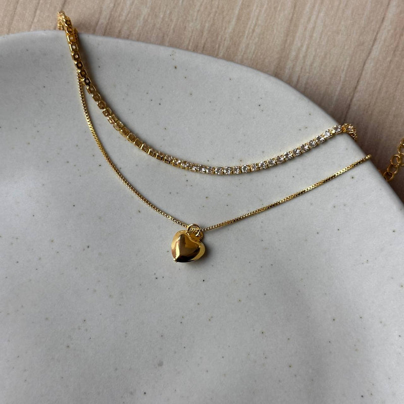 Pulseira Dupla - Riviera com Coração - Joia Banhada a Ouro 18k